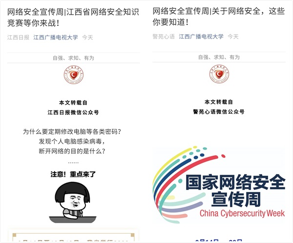 2020年国家网络安全宣传周于9月14日至20日在全国范围内统一开展,主题为“网络安全为人民,网络安全靠人民”。我校高度重视、迅速行动,为深入贯彻落实习近平总书记关于网络强国的重要思想,特别是“四个坚持”的重要指示,结合疫情防控实际需要,学校党委宣传部联合现代教育技术中心,采取线上活动为主、线上线下相结合的方式,通过网站宣传、网络直播、楼宇外墙大屏字幕等多种方式,发动学校教职工广泛参与,深入开展宣传教育活动,使广大教职工更直观的感受到网络安全在日常生活中的重要性,不断增强自身防范意识,提高网络安全知识。