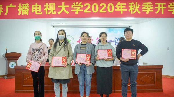 刘蓓洁首先宣读了2020年春季网上学习之星、国家开放大学奖学金及“希望的田野”奖学金、宜春广播电视大学新冠疫情防控先进个人及优秀志愿者的表彰决定。与会领导为获得荣誉的学员颁发荣誉证书及奖品,并表示祝贺,希望受表彰的同学珍惜荣誉,在今后的学习和工作中再接再厉,再创佳绩。
