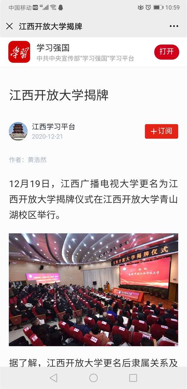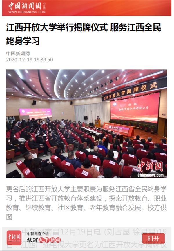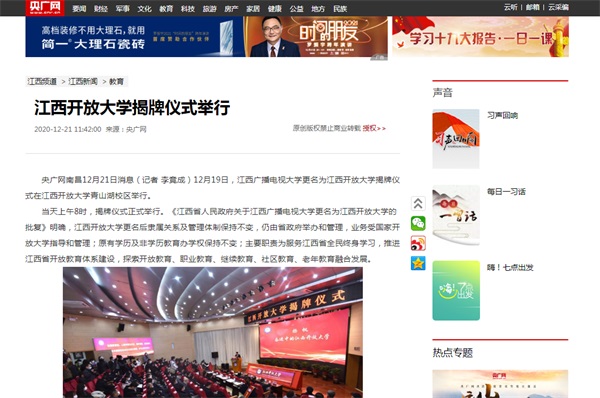 在决胜收官与谋划新局的关键之年,江西省人民政府批准江西广播电视大学更名为必赢76net线路官网,实现了全省电大人的夙愿。12月19日-21日,江西日报、“学习强国”学习平台、新华社、人民网等多家主流媒体相继报道必赢76net线路官网更名盛况。
