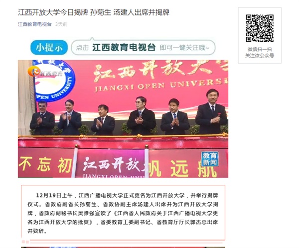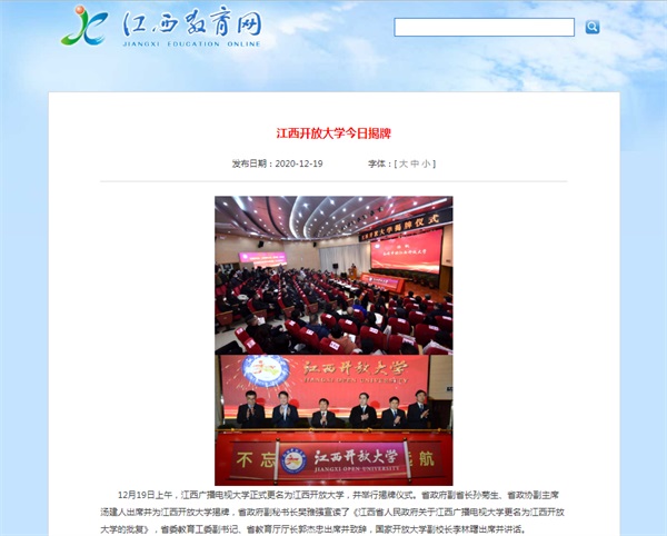 在决胜收官与谋划新局的关键之年,江西省人民政府批准江西广播电视大学更名为必赢76net线路官网,实现了全省电大人的夙愿。12月19日-21日,江西日报、“学习强国”学习平台、新华社、人民网等多家主流媒体相继报道必赢76net线路官网更名盛况。