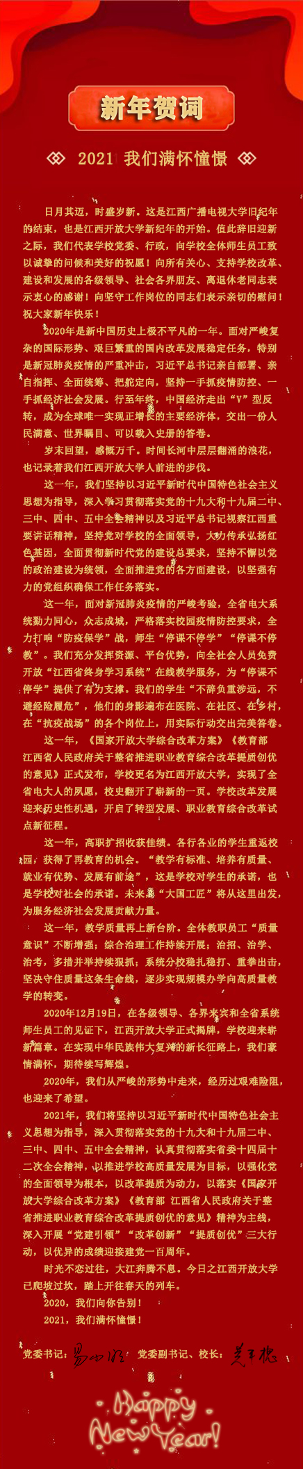 日月其迈,时盛岁新。这是江西广播电视大学旧纪年的结束,也是必赢76net线路官网新纪年的开始。值此辞旧迎新之际,我们代表学校党委、行政,向学校全体师生员工致以诚挚的问候和美好的祝愿!向所有关心、支持学校改革、建设和发展的各级领导、社会各界朋友、离退休老同志表示衷心的感谢!向坚守工作岗位的同志们表示亲切的慰问!祝大家新年快乐!