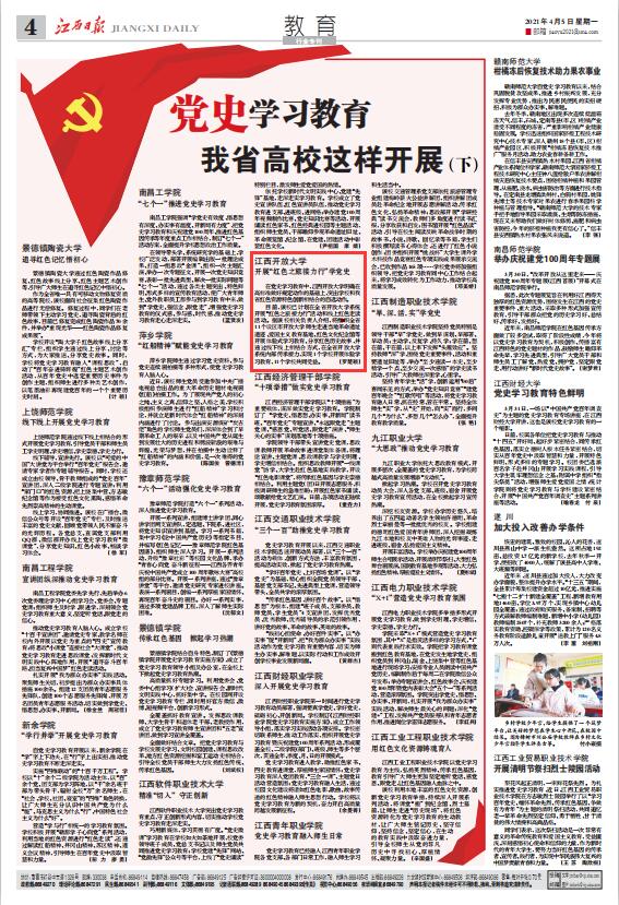 4月5日,江西日报、学习强国、江西新闻客户端等媒体以《党史学习教育 我省高校这样开展(下)》为题,报道江西省各大高校党史学习教育情况,我校《开展“红色之旅接力行”学党史》收录其中。