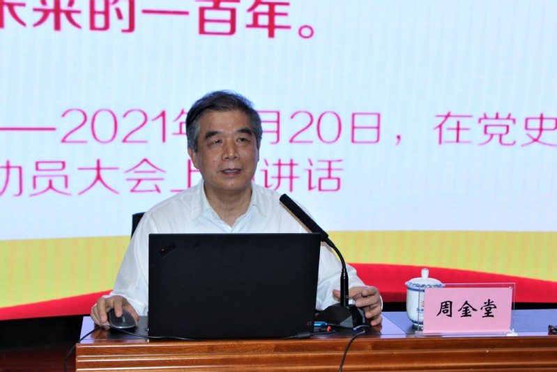 会上,周金堂教授作《从党的历史中汲取智慧和力量》专题辅导。周教授首先从当下国际、国内的背景形势出发,阐明了开展党史学习教育的重要意义,而后从“突出政治战略,体现时代特色”“围绕主题主线,反映主流本质”“资料来源丰富,重视披露新指标”三个方面对《毛泽东 邓小平 江泽民 胡锦涛关于中国共产党历史论述摘编》一书进行了详细的解读。他指出,这本书的发行对广大党员学习了解历史,从历史中汲取智慧和力量,增强“四个意识”,坚定“四个自信”,做到“两个维护”,全面建设社会主义现代化国家,实现中华民族伟大复兴的中国梦,具有重要的指导意义。