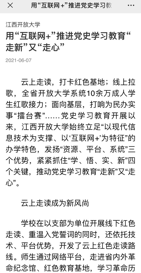 党史学习教育开展以来,学校充分发挥“互联网+”特色,紧紧抓住“学、悟、实、新”四个关键,推动党史学习教育“走新”又“走心”。6月7日,江西日报、学习强国、江西新闻等媒体相继对此进行报道。