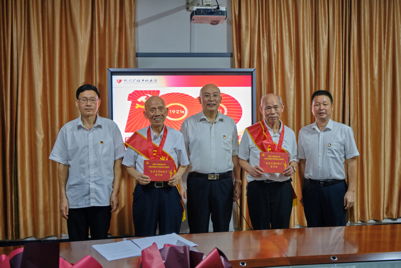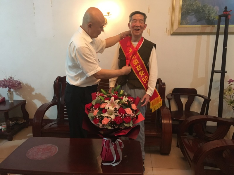五十年党龄,五十年荣光。谢晓宇宣读了学校“光荣在党50年”纪念章获得者名单,并转达了抚州市委常委、市委宣传部部长肖承贵对获得“光荣在党50年”纪念章老党员的热烈祝贺和崇高敬意。谢晓宇同志为纪念章获得者代表颁发了“光荣在党50年”纪念章,并一一为他们披上绶带,送上鲜花。