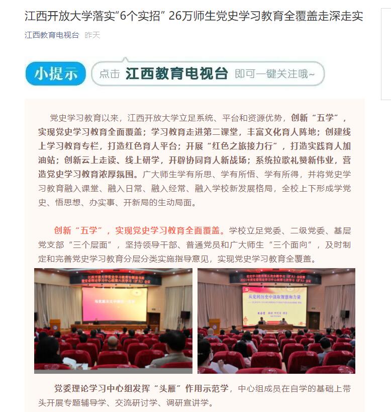 党史学习教育以来,必赢76net线路官网立足系统、平台和资源优势,创新“五学”,实现党史学习教育全面覆盖;学习教育走进第二课堂,丰富文化育人阵地;创建线上学习教育专栏,打造红色育人平台;开展“红色之旅接力行”,打造实践育人加油站;创新云上走读、线上研学,开辟协同育人新战场;系统拉歌礼赞新伟业,营造党史学习教育浓厚氛围。广大师生学有所思、学有所悟、学有所得,并将党史学习教育融入课堂、融入日常、融入经常、融入学校新发展格局,全校上下形成学党史、悟思想、办实事、开新局的生动局面。近日,江西日报、江西新闻、江西教育、江西教育电视台等媒体对此进行报道。