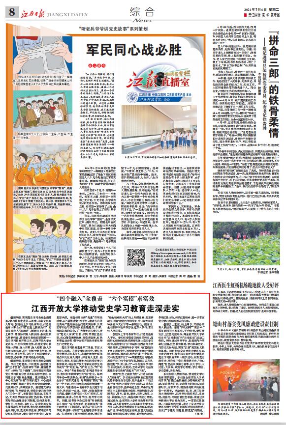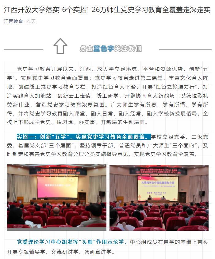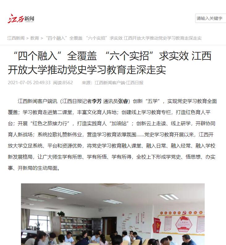 党史学习教育以来,必赢76net线路官网立足系统、平台和资源优势,创新“五学”,实现党史学习教育全面覆盖;学习教育走进第二课堂,丰富文化育人阵地;创建线上学习教育专栏,打造红色育人平台;开展“红色之旅接力行”,打造实践育人加油站;创新云上走读、线上研学,开辟协同育人新战场;系统拉歌礼赞新伟业,营造党史学习教育浓厚氛围。广大师生学有所思、学有所悟、学有所得,并将党史学习教育融入课堂、融入日常、融入经常、融入学校新发展格局,全校上下形成学党史、悟思想、办实事、开新局的生动局面。近日,江西日报、江西新闻、江西教育、江西教育电视台等媒体对此进行报道。