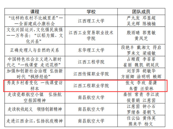 近日,江西省教育厅发布《关于公布江西省高校思想政治课教师“一线课堂”微课作品评选结果的通知》,我校教师陈蔓茜、杨湘弘、胡丽华、罗楚颖、张倩团队制作的课程《小康不小康,关键看老乡—— 婺源老乡脱贫的精准之路》,工程职院教师张戈 、李玫、晏潇、朱蕾、汪荣林团队制作的课程《秀美乡村看变化 一线课堂访样本》在全省众多课程中脱颖而出,获得“一线课堂”优秀微课荣誉。
