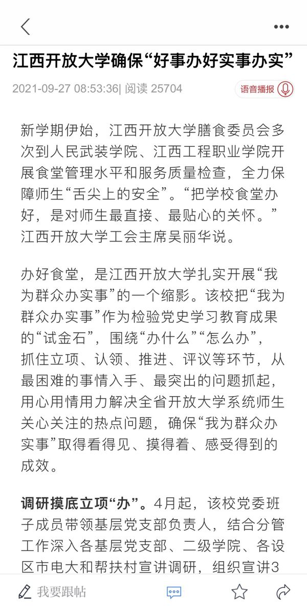党史学习教育开展以来,我校把“我为群众办实事”作为检验党史学习教育成果的“试金石”,围绕“办什么”“怎么办”,抓住立项、认领、推进、评议等环节,从最困难的事情入手、最突出的问题抓起,用心用情用力解决全省开放大学系统师生关心关注的热点问题,确保“我为群众办实事”取得看得见、摸得着、感受得到的成效。9月27日,江西日报、江西新闻客户端对此进行报道。