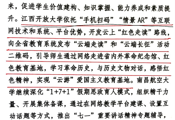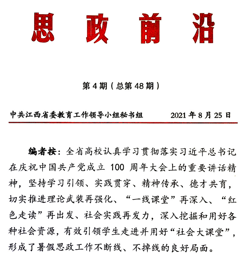 暑假期间,我校持续推动党史学习教育走深走实,引导学生走入“云上课堂”,做到暑期思政工作不断线、不掉线。近日,由江西省高校思想政治工作领导小组办公室主办的《思政前沿》(2021年第4期)刊载《全省高校暑期思政工作不断线》一文,文章引用我校开展暑期思政工作相关举措:必赢76net线路官网依托“手机扫码”“情景VR”等互联网技术和系统、平台优势,开发云上“红色走读”路线,向全省教育系统发布“云端走读”和“云端长征”活动二维码,引导师生通过网络走进省内外革命纪念馆、红色教育基地,学习革命历史,与历史文物对话,感悟红色精神,实现“云游”爱国主义教育基地。