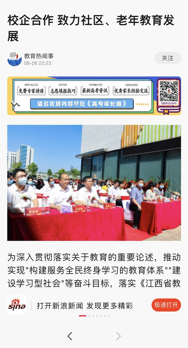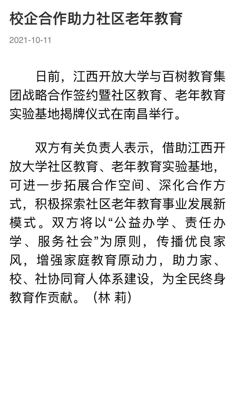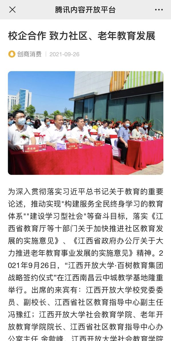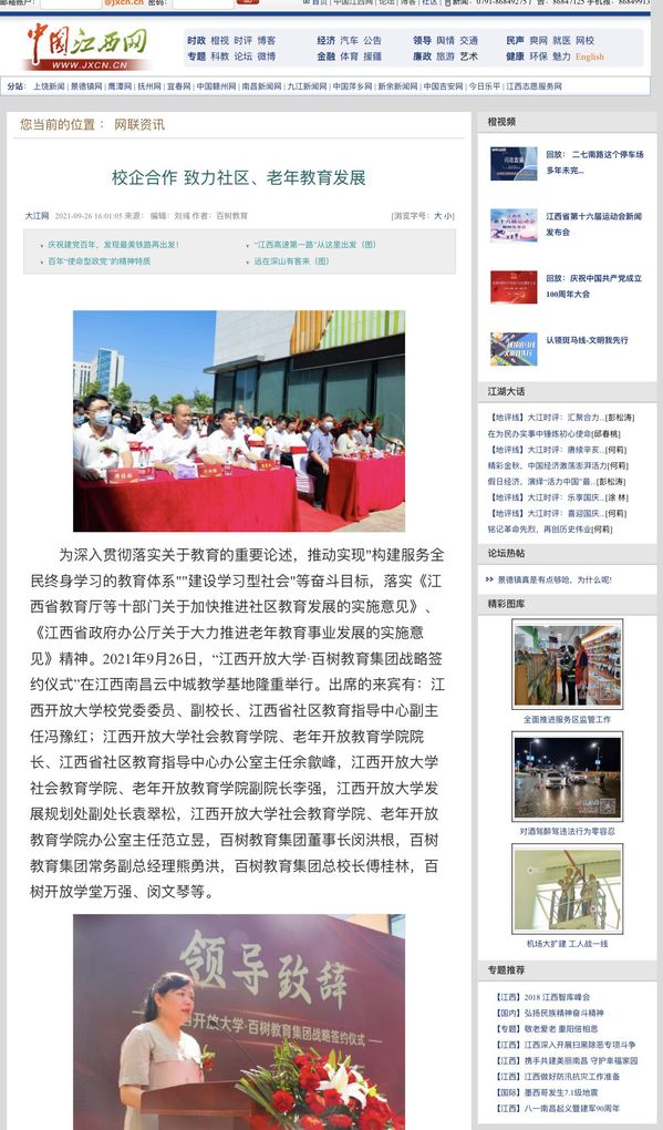 日前,必赢76net线路官网与百树教育集团战略合作签约暨社区教育、老年教育实验基地揭牌仪式在南昌举行。江西日报、大江网、江西新闻等多家媒体报道我校以校企合作助推社区老年教育。