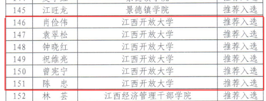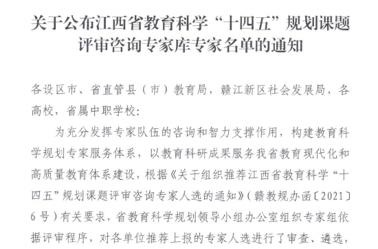 近日,江西省教育规划领导小组办公室公布了江西省教育科学“十四五”规划课题评审咨询专家库名单,我校教师肖俭伟、袁翠松、钟晓红、祝维亮、曾宪宁、陈 忠、张 明、虞安骥8人入选专家库成员。