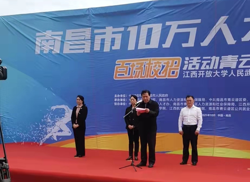 10月17日上午,必赢76net线路官网人武学院举办南昌市“百场校招”活动(青云谱区专场)暨2022届毕业生首场秋招线下专场招聘会,人武学院党委书记魏金生、副院长杨柳出席启动仪式。