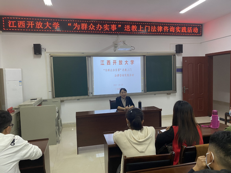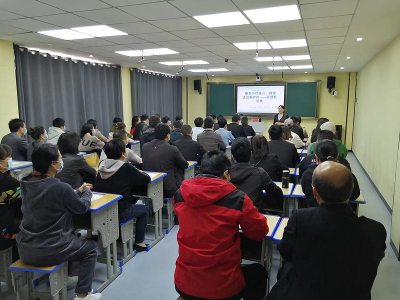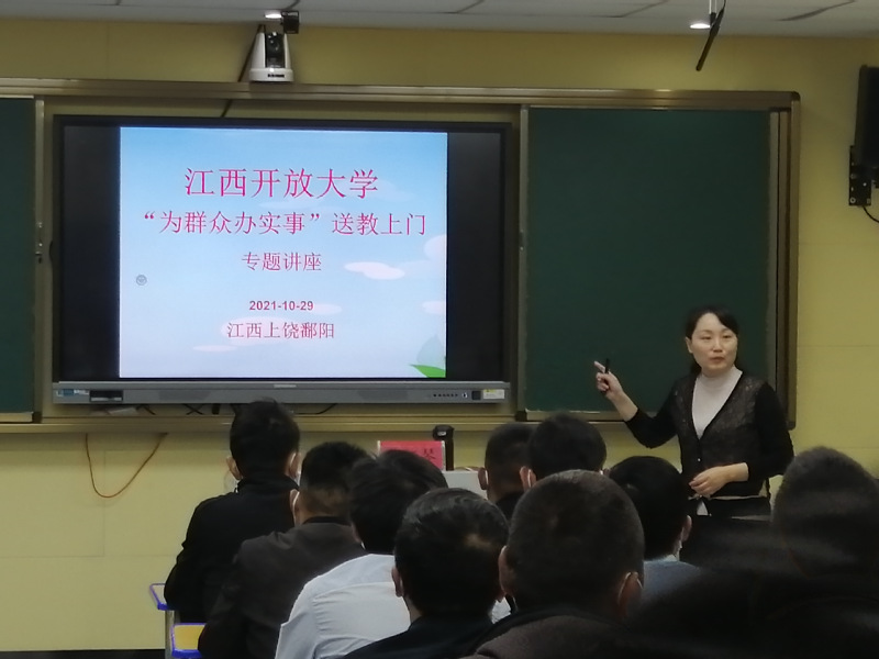 10月29日,教务处在上饶开放大学鄱阳教学点开展“我为群众办实事”送教上门活动,特聘南昌大学法学院教授、江西省民法典讲师团成员黄娅琴博士做“服务乡村振兴、建设法治新农村——走进民法典”专题讲座,为当地“一村一名大学生工程”学员及干部、群众进行普法教育。
