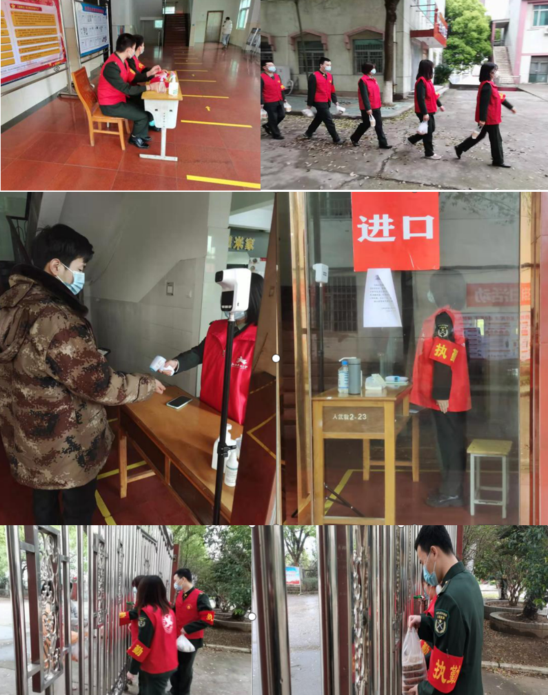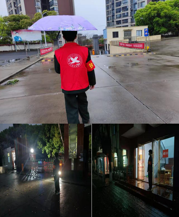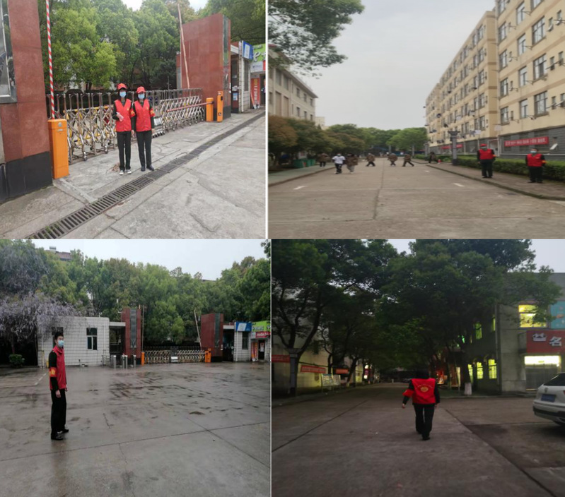 (志愿者在学校各处巡查,督促口罩,管控外卖、快递不进校门)