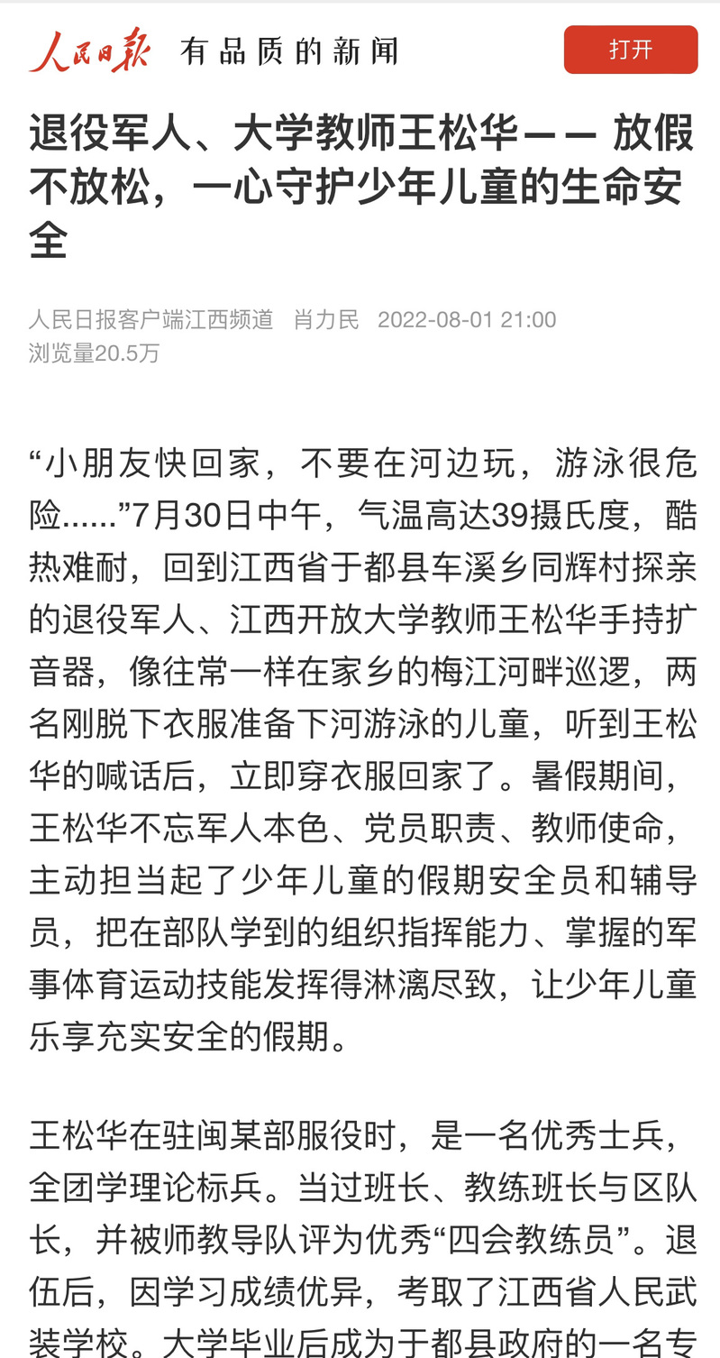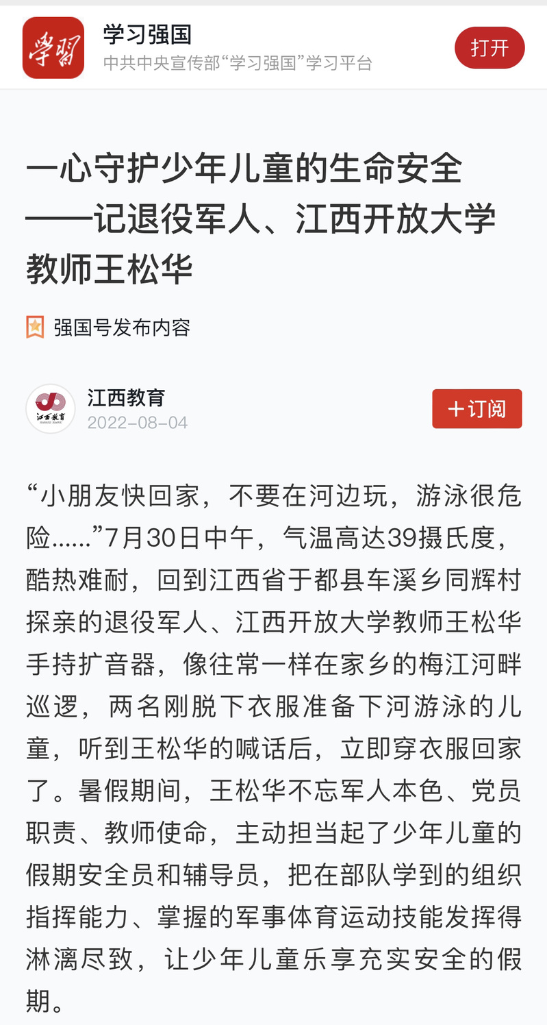 暑假期间我校教师王松华主动担当起家乡少年儿童的假期安全员和辅导员每日巡查河堤守护少年儿童生命安全并主动教授小孩子体育运动技能让少年儿童乐享充实安全的假期人民日报客户端江西频道学习强国对此进行报道中国教育发布app首页推荐