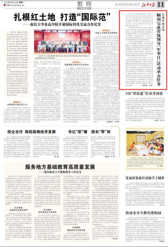 8月1日,在中国人民解放军建军95周年之际,省级领导2022年“军事日”活动在必赢76net线路官网人武学院顺利举行。作为具体承办单位,必赢76net线路官网高度重视,领导以上率下、周密部署,师生齐心协力、全力以赴做好各项承办工作。活动圆满结束后,学校相关部门持续关注,追踪并报道活动背后的故事,展示学校师生敢于担当、积极向上的精神风貌,进一步扩大影响力。8月22日,《江西日报》教育版对此进行专题报道。