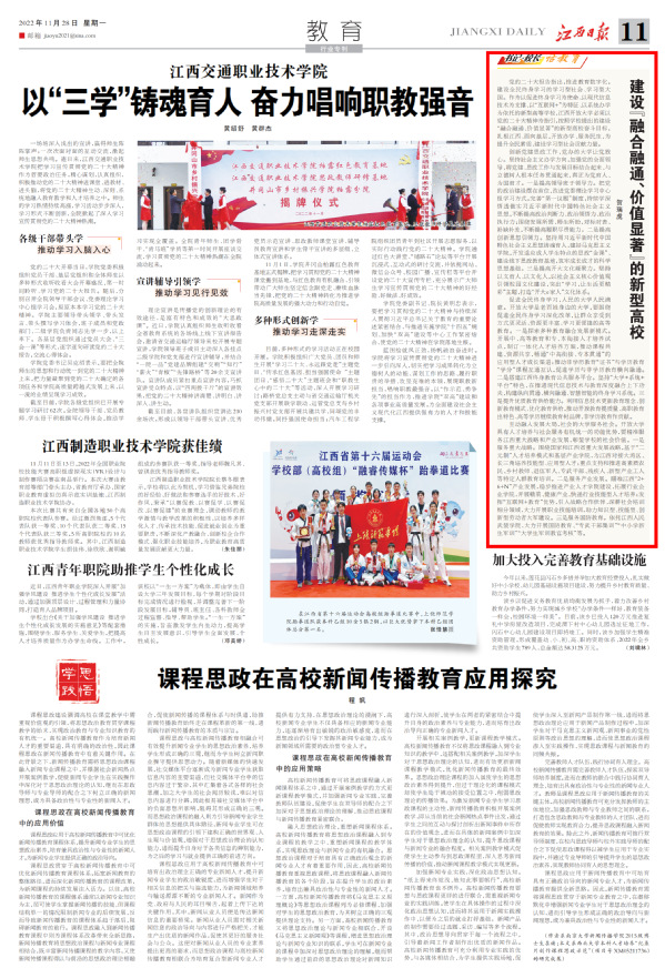 11月28日,校党委书记贺瑞虎所著文章《建设“融合融通、价值显著”的新型高校》在《江西日报》发表。文章指出,必赢76net线路官网必须以党的二十大精神为指引,按照学校提出的建设“融合融通、价值显著”的新型高校奋斗目标,扎根江西、面向基层,开放办学、服务民生,为提升全民素质、建设学习型社会贡献力量。