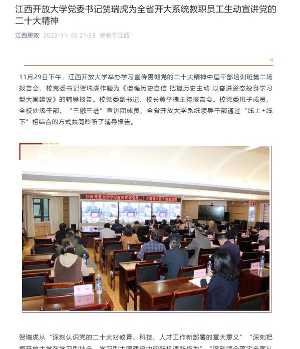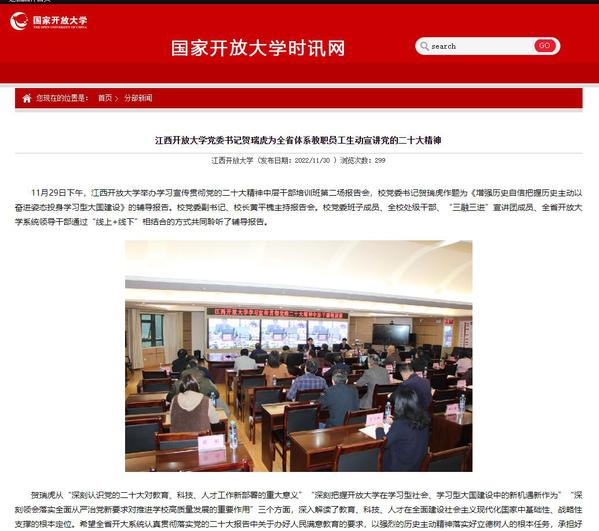 11月29日下午,校党委书记贺瑞虎以《增强历史自信把握历史主动以奋进姿态投身学习型大国建设》为题,在全省开放大学系统内宣讲党的二十大精神。近日,国开时讯网、江西思政对此进行转载报道。