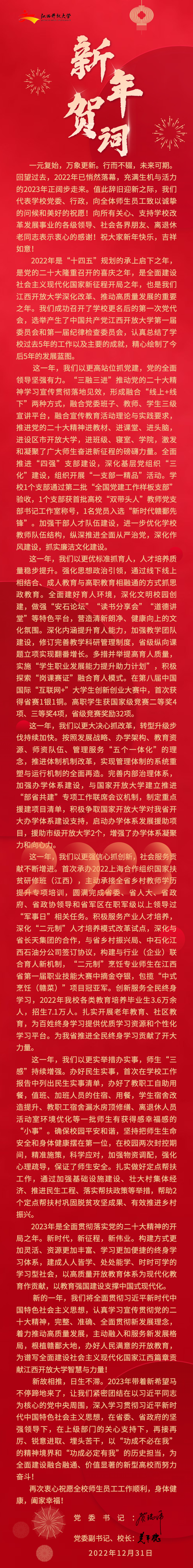 一元复始万象更新。行而不辍,未来可期。回望过去,2022年已悄然落幕,充满生机与活力的2023年正阔步走来。值此辞旧迎新之际,我们代表学校党委、行政,向全体师生员工致以诚挚的问候和美好的祝愿!向所有关心、支持学校改革发展事业的各级领导、社会各界朋友、离退休老同志表示衷心的感谢!祝大家新年快乐,吉祥如意!