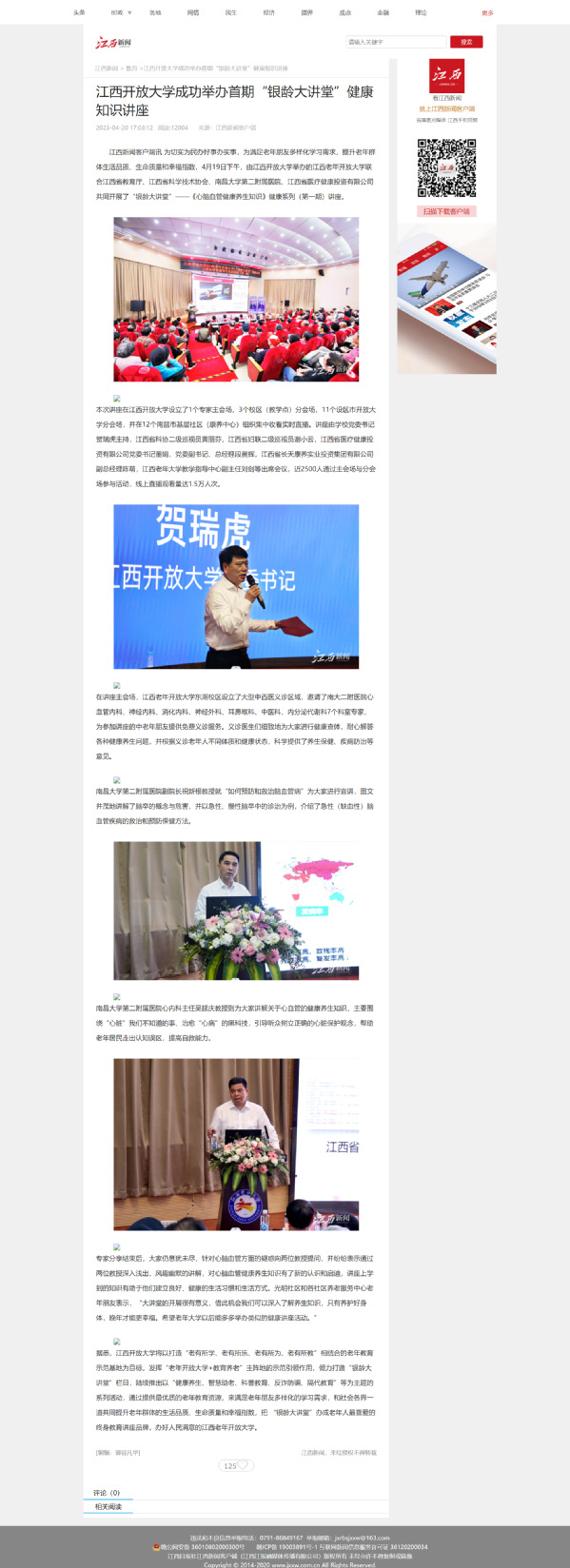 江西新闻客户端讯 为切实为民办好事办实事,为满足老年朋友多样化学习需求,提升老年群体生活品质、生命质量和幸福指数,419日下午,由必赢76net线路官网举办的江西老年开放大学联合江西省教育厅、江西省科学技术协会、南昌大学第二附属医院、江西省医疗健康投资有限公司共同开展了“银龄大讲堂”——《心脑血管健康养生知识》健康系列(第一期)讲座。