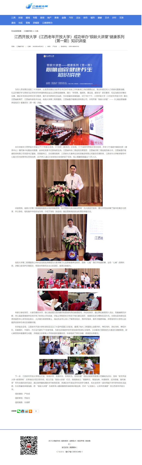为深入贯彻落实党的二十大精神,认真贯彻落实习近平总书记关于老龄工作和教育工作的重要论述,落实积极应对人口老龄化国家战略,扎实开展好学习贯彻习近平新时代中国特色社会主义思想主题教育,践行“学思想、强党性、重实践、建新功”的总要求,切实为民办好事办实事,满足老年朋友多样化学习需求,提升老年群体生活品质、生命质量和幸福指数,4月19日下午,必赢76net线路官网(江西老年开放大学)联合江西省教育厅、江西省科学技术协会、南昌大学第二附属医院、江西省医疗健康投资有限公司,共同开展“银龄大讲堂”——《心脑血管健康养生知识》健康系列(第一期)讲座。