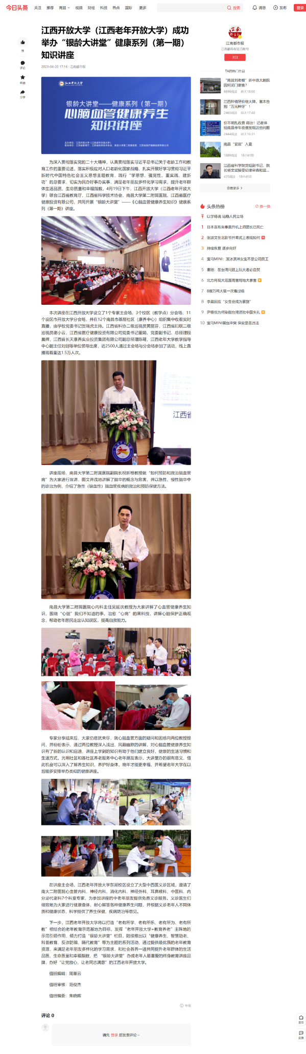 为深入贯彻落实党的二十大精神,认真贯彻落实习近平总书记关于老龄工作和教育工作的重要论述,落实积极应对人口老龄化国家战略,扎实开展好学习贯彻习近平新时代中国特色社会主义思想主题教育,践行“学思想、强党性、重实践、建新功”的总要求,切实为民办好事办实事,满足老年朋友多样化学习需求,提升老年群体生活品质、生命质量和幸福指数,419日下午,必赢76net线路官网(江西老年开放大学)联合江西省教育厅、江西省科学技术协会、南昌大学第二附属医院、江西省医疗健康投资有限公司,共同开展“银龄大讲堂”——《心脑血管健康养生知识》健康系列(第一期)讲座。