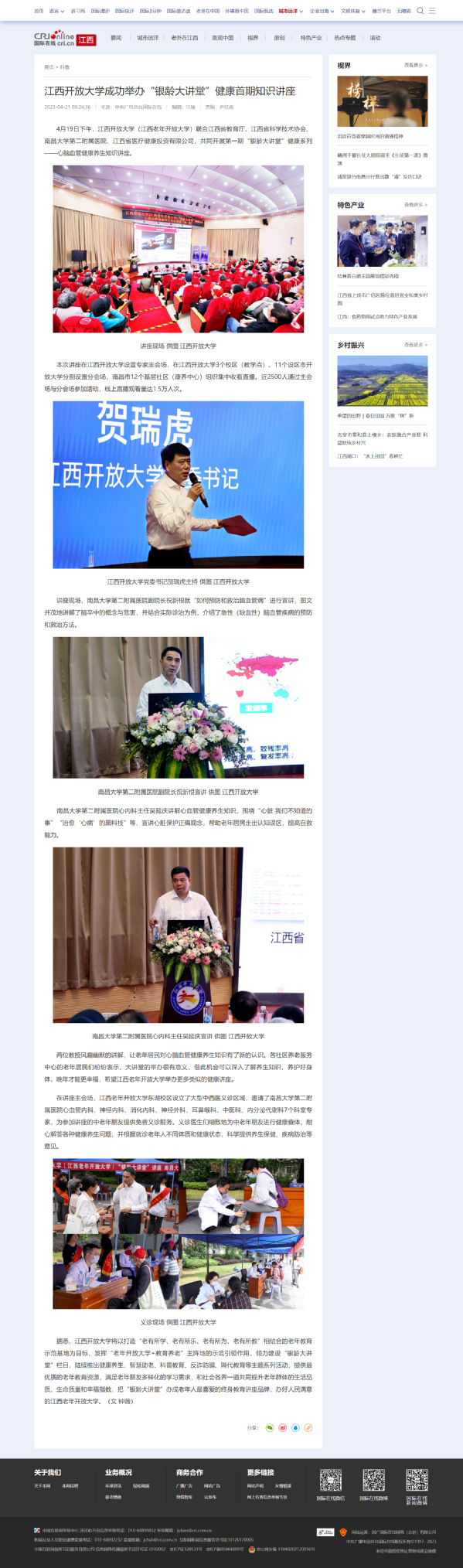 4月19日下午,必赢76net线路官网(江西老年开放大学)联合江西省教育厅、江西省科学技术协会、南昌大学第二附属医院、江西省医疗健康投资有限公司,共同开展第一期“银龄大讲堂”健康系列——心脑血管健康养生知识讲座。
