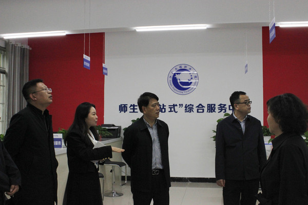 贺瑞虎一行首先实地察看了“一站式”学生服务中心仔细询问服务中心运行情况,人员值班情况,学生咨询情况等。他指出,要进一步夯实“以学生为中心”的服务理念,以学生的实际需求为导向,科学谋划,合理布局,充分发挥一站式学生服务中心的作用,助力学生成长成才。