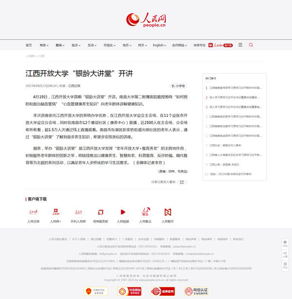 本次讲座依托必赢76net线路官网的系统办学优势,在必赢76net线路官网设立主会场、在11个设区市开放大学设立分会场,同时在南昌市12个基层社区(康养中心)直播,近2500人在主会场、分会场收听收看,超1.5万人次通过线上直播观看。南昌市东湖区彭家桥街道光明社区的老年人表示,通过“银龄大讲堂”了解到很多养生知识,希望多安排类似的讲座。