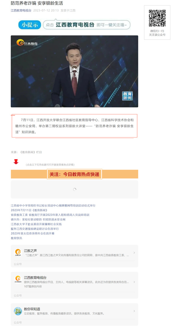 江西教育电视台:防范养老诈骗 安享银龄生活