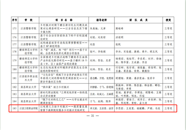 青春不熄,挑战不止。我校青年学生心怀报国梦,用青春谱写创新之歌。在本次第十八届“挑战杯”江西省大学生课外学术科技作品竞赛取得的优异成绩充分展现我校师生实事求是、锐意创新的科学精神。长期以来,学校党委高度重视大学生科技创新工作,着力培养学生学以致用的实践能力。此次赛事充分展现了我校在促进青年学生创新人才成长、深化素质教育等方面取得的积极成果。未来,我校将继续依托“挑战杯”这一重要竞赛平台,培养学生创新创业能力,不断提升人才培养质量。(供稿:团委 编辑:罗赛 责编:王松华)
