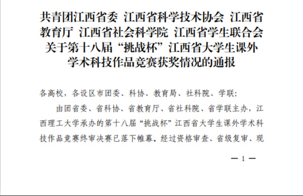 近日,由团省委、省科协、省教育厅、省社科院、省学联主办,江西理工大学承办的第十八届“挑战杯”江西省大学生课外学术科技作品竞赛终审已落下帷幕,第十八届“挑战杯”江西省大学生课外学术科技作品竞赛圆满结束。经过资格审查、省级复审、公开答辩和组委会、评委会综合审定,预通知公示后,现已正式张榜,我校推送的六个作品,均斩获三等奖的佳绩!