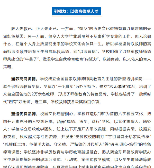 巍峨武功,人杰地灵;红色安源,人才荟萃。百余年前,在江西萍乡这片热土上诞生了安源路矿工人补习夜校,这是中国共产党应革命需要开展继续教育的一次卓越创举。今天,萍乡开放大学传承安源精神、赓续红色血脉,以“引领力+倒逼力+凝聚力”三力拉动、“以德育德+从严治考+用心服务”三轮驱动,奋力谱写以德育德、以文化人的开放教育新篇章。