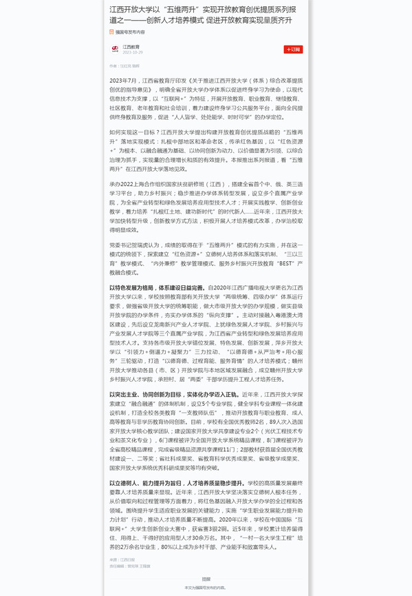 2023年7月,江西省教育厅印发《关于推进必赢76net线路官网(体系)综合改革提质创优的指导意见》,明确全省开放大学办学体系以促进终身学习为使命,以现代信息技术为支撑,以“互联网+”为特征,开展开放教育、职业教育、继续教育、社区教育、老年教育和社会培训,着力建设终身学习公共服务平台,面向全民提供终身教育及服务,促进“人人皆学、处处能学、时时可学”的办学定位。