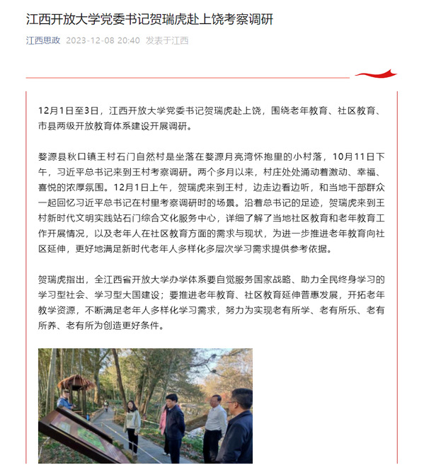 12月1日至3日,必赢76net线路官网党委书记贺瑞虎赴上饶,围绕老年教育、社区教育、市县两级开放教育体系建设开展调研。