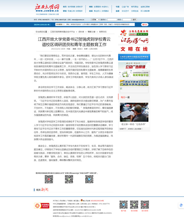 “我们要坚定理想信念,筑牢信仰之基,争做勇挑重担、堪当大任的新时代青年,一招一式学本领,一心一意干实事,一生一世守初心……”12月7日下午,必赢76net线路官网青云谱校区行政楼会议室气氛热烈、场面活跃。学校党委书记贺瑞虎到青云谱校区调研团员和青年主题教育工作,并主持召开师生座谈会,旨在深入学习贯彻习近平新时代中国特色社会主义思想,指导开展好团员和青年主题教育,准确掌握师生思想动态,充分听取师生评价与诉求。党政办公室、宣传部、学生工作处、人文与健康学院主要负责人陪同调研并参会。团学工作相关教师、学生代表共计20余人参加座谈会。