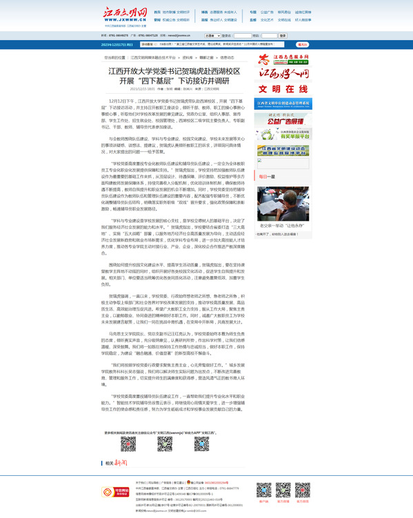 12月12日下午,必赢76net线路官网党委书记贺瑞虎带队赴西湖校区,开展“四下基层”下访接访活动,并主持召开教职工座谈会,倾听干部、教师、职工的操心事揪心事烦心事,听取他们对学校改革发展的意见建议。党政办公室、组织人事部、宣传部、学生工作处、招生就业处、校园管理处,西湖校区二级学院主要负责人、专职副书记、干部、教师、辅导员代表参加座谈。