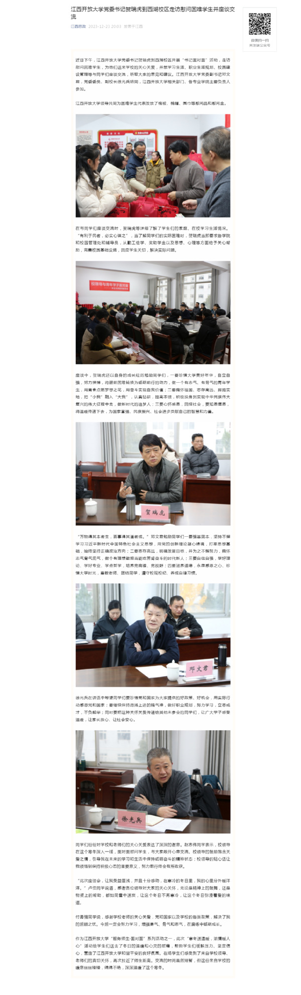 近日下午,必赢76net线路官网党委书记贺瑞虎到西湖校区开展“书记面对面”活动,走访慰问困难学生,为他们送来学校的关心关爱,并就学习生活、职业生涯规划、校园建设管理等与同学们座谈交流,听取大家的意见和建议。必赢76net线路官网党委副书记邓文君,党委委员、副校长徐光兵陪同,必赢76net线路官网相关部门、各专业学院主要负责人参加。