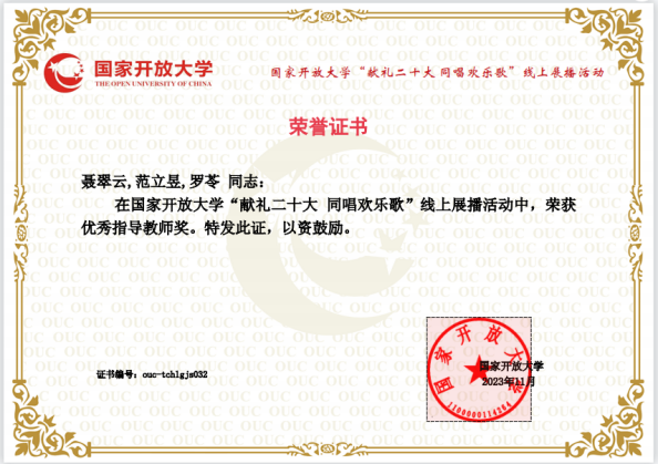 近日,国家开放大学公布了“献礼二十大 共跳幸福舞”“献礼二十大 同唱欢乐歌”活动优秀组织单位和优秀指导教师评选结果,学校报送的作品在活动中获得佳绩。