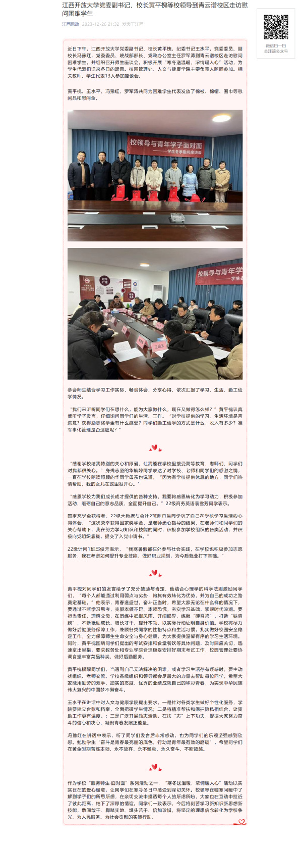 近日下午,必赢76net线路官网党委副书记、校长黄平槐,纪委书记王水平,党委委员、副校长冯豫红,党委委员、统战部部长、党政办公室主任罗军涛到青云谱校区走访慰问困难学生,并组织召开师生座谈会,积极开展“寒冬送温暖,浓情暖人心”活动,为学生代表们送来冬日的暖意。校园管理处、人文与健康学院主要负责人陪同参加。相关教师、学生代表13人参加座谈会。