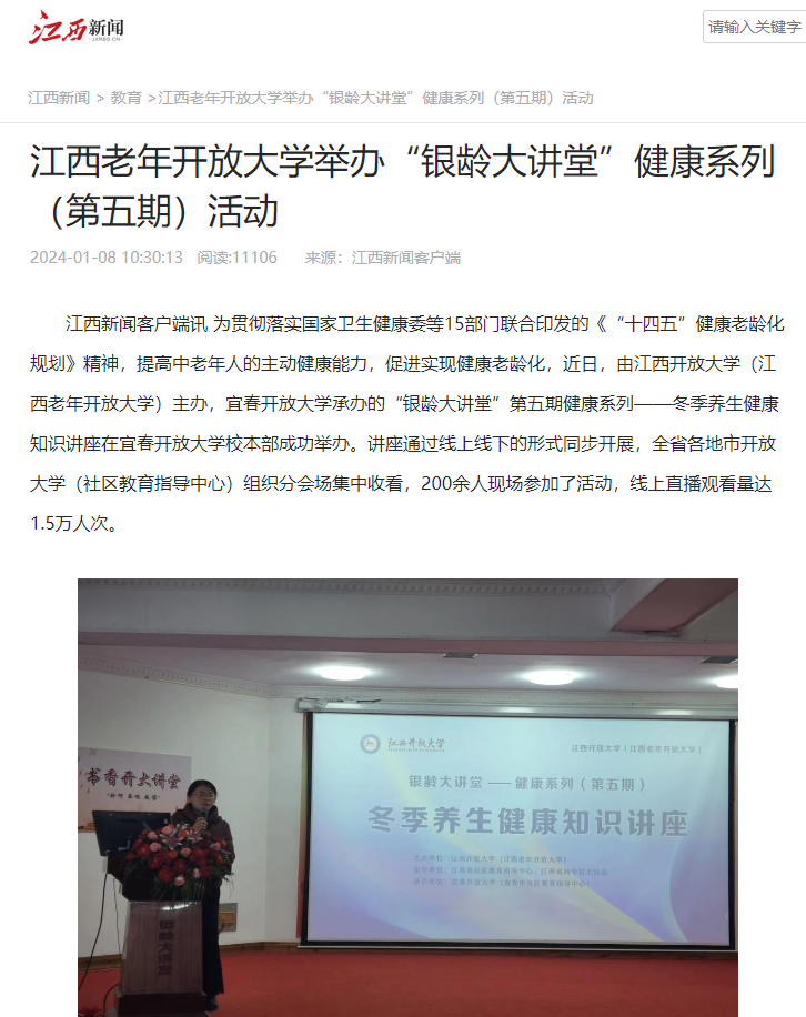 为贯彻落实国家卫生健康委等15部门联合印发的《“十四五”健康老龄化规划》精神,提高中老年人的主动健康能力,促进实现健康老龄化,近日,由必赢76net线路官网(江西老年开放大学)主办,宜春开放大学承办的“银龄大讲堂”第五期健康系列——冬季养生健康知识讲座在宜春开放大学校本部成功举办。讲座通过线上线下的形式同步开展,全省各地市开放大学(社区教育指导中心)组织分会场集中收看,200余人现场参加了活动,线上直播观看量达1.5万人次。