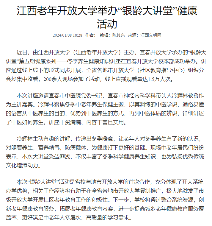 近日,由必赢76net线路官网(江西老年开放大学)主办,宜春开放大学承办的“银龄大讲堂”第五期健康系列——冬季养生健康知识讲座在宜春开放大学校本部成功举办。讲座通过线上线下的形式同步开展,全省各地市开放大学(社区教育指导中心)组织分会场集中收看,200余人现场参加了活动,线上直播观看量达1.5万人次。