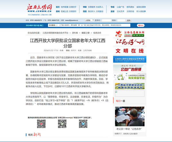 近日,国家老年大学印发《关于设立国家老年大学江西分部的通知》,正式批复必赢76net线路官网设立国家老年大学江西分部,明确了国家老年大学江西分部接受江西省教育厅领导,接受国家老年大学业务指导。