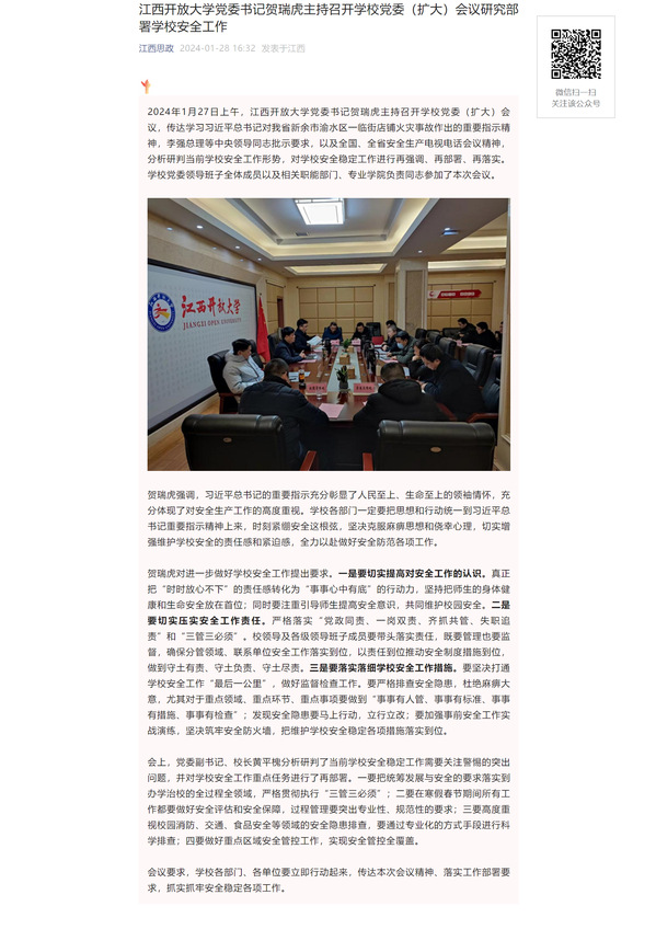2024年1月27日上午,必赢76net线路官网党委书记贺瑞虎主持召开学校党委(扩大)会议,传达学习习近平总书记对我省新余市渝水区一临街店铺火灾事故作出的重要指示精神,李强总理等中央领导同志批示要求,以及全国、全省安全生产电视电话会议精神,分析研判当前学校安全工作形势,对学校安全稳定工作进行再强调、再部署、再落实。学校党委领导班子全体成员以及相关职能部门、专业学院负责同志参加了本次会议。