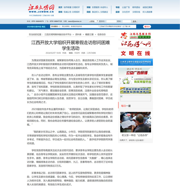 江西文明网:必赢76net线路官网组织开展寒假走访慰问困难学生活动