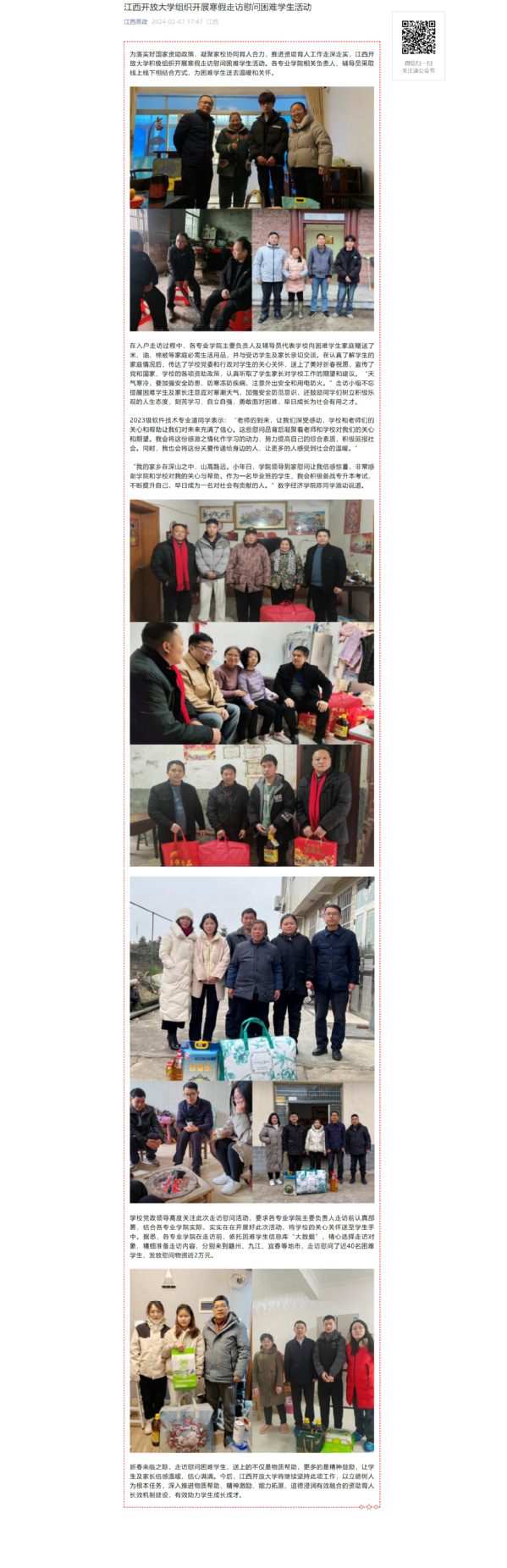 为落实好国家资助政策,凝聚家校协同育人合力,推进资助育人工作走深走实,必赢76net线路官网积极组织开展寒假走访慰问困难学生活动。各专业学院相关负责人、辅导员采取线上线下相结合方式,为困难学生送去温暖和关怀。原文地址:https://mp.weixin.qq.com/s?__biz=MzI1OTM4MDMzMA==&mid=2247583845&idx=2&sn=1511f1e134000c47dbc218c4b1066386&chksm=ea7a0d60dd0d8476b1a0540aefa27fe7fea648cd390fb84aad1c9cdce07c13331830dfda5eb3&mpshare=1&scene=23&srcid=0208yHJ8uA5UYWzepMyjM7Vq&sharer_shareinfo=b397d8ac35e1d9f231347466ec5e9470&sharer_shareinfo_first=89bc87544a471e3b7f228ec8b2215a1f#rd (责任编辑:罗楚颖)