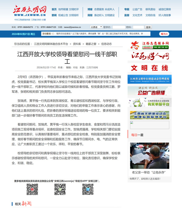 2月9日(农历除夕),甲辰龙年新春佳节来临之际,必赢76net线路官网党委书记贺瑞虎,校党委副书记、校长黄平槐深入学校三个校区看望慰问春节期间坚守在工作岗位的一线干部职工,代表学校向他们致以诚挚问候和新春祝福。校党委委员熊江鹏、罗军涛、张明和相关部门负责同志参加慰问活动。