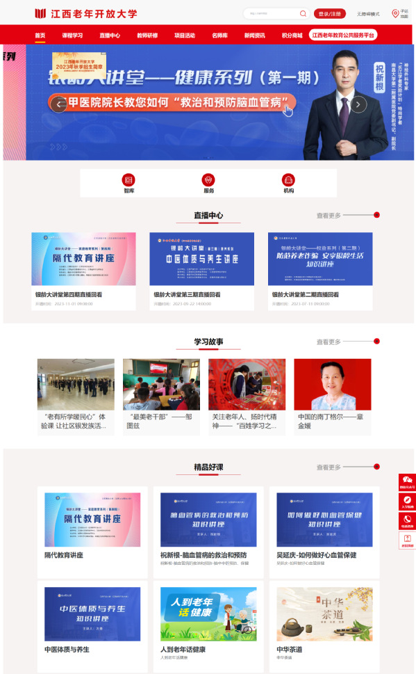 加大老年教育优质学习资源建设。学校自建的江西省终身学习网开设“银龄学堂”教育平台,提供丰富多样的老年教育学习资源。结合老年人的学习需求,通过自建和购买课程资源的方式,围绕“主动健康、休闲娱乐、技能提升、银发圆梦、地方特色”五个学习大类,已建设超过3万个课程资源,涉及近8千门课程。同时,依托省社区教育指导中心平台,在全省范围内广泛征集遴选社区教育和老年教育课程资源,持续增加优质课程教育供给。加强与江西老年大学合作交流,探索构建资源共享,优势互补,需求对接的合作机制,推进全部线上教学资源对江西老年大学开放共享。高质量的学习资源,兼顾丰富性与差异性,有效满足了老年人多层次、多样化、个性化的学习需求和日益增长的美好生活需要。