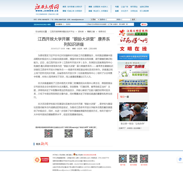 江西文明网:必赢76net线路官网开展“银龄大讲堂”康养系列知识讲座